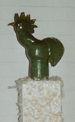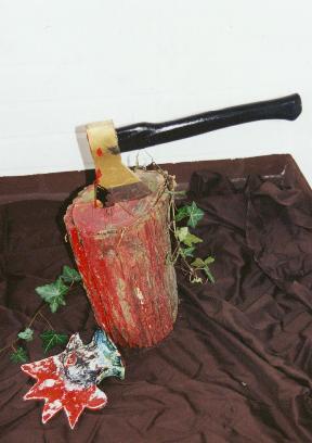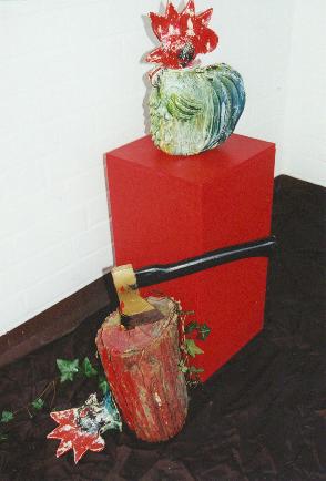"Der Hahn - Der Hahn ist tot", Installation nach zwei Texten, 1999. Holz, Keramik, Efeu, Beil. | |